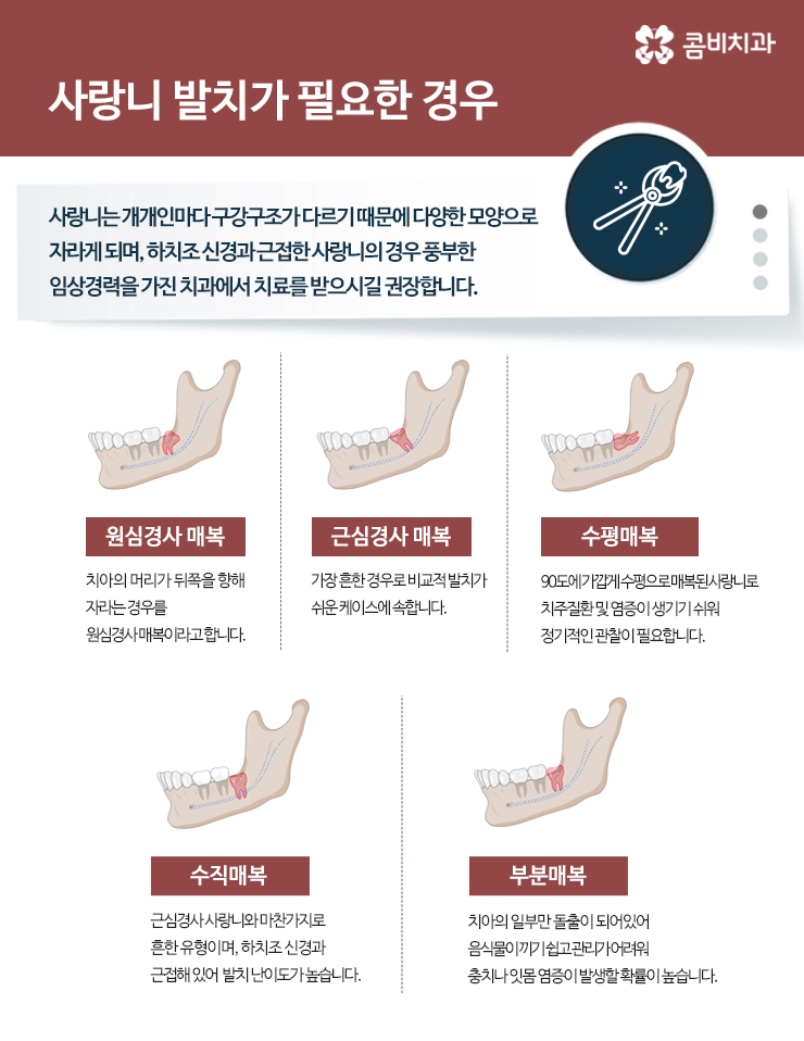 사랑니에 문제가 발생하기 시작했다면 여러 증상들로 알아차릴 수 있는 신호가 있는데 초기에는 입냄새가 될 수도 있겠고 사랑니 주변 잇몸이 붓거나 출혈, 염증이 발생되는 경우도 있습니다. 사랑니 통증이 이미 상당 부분 불편함을 느낄 정도로 인식되기 시작했다면 빠른 치료를 요구하게 되는데 대표적으로 사랑니 통증의 원인은 충치로 사랑니 자체가 썩는 문제가 발생되는 일이겠지만 경우에 따라서는 사랑니의 위치나 자라는 방향이 좋지 않아서 발생되기도 하므로 평소 칫솔질을 잘하고 있다고 해서 검진을 미뤄서는 안됩니다