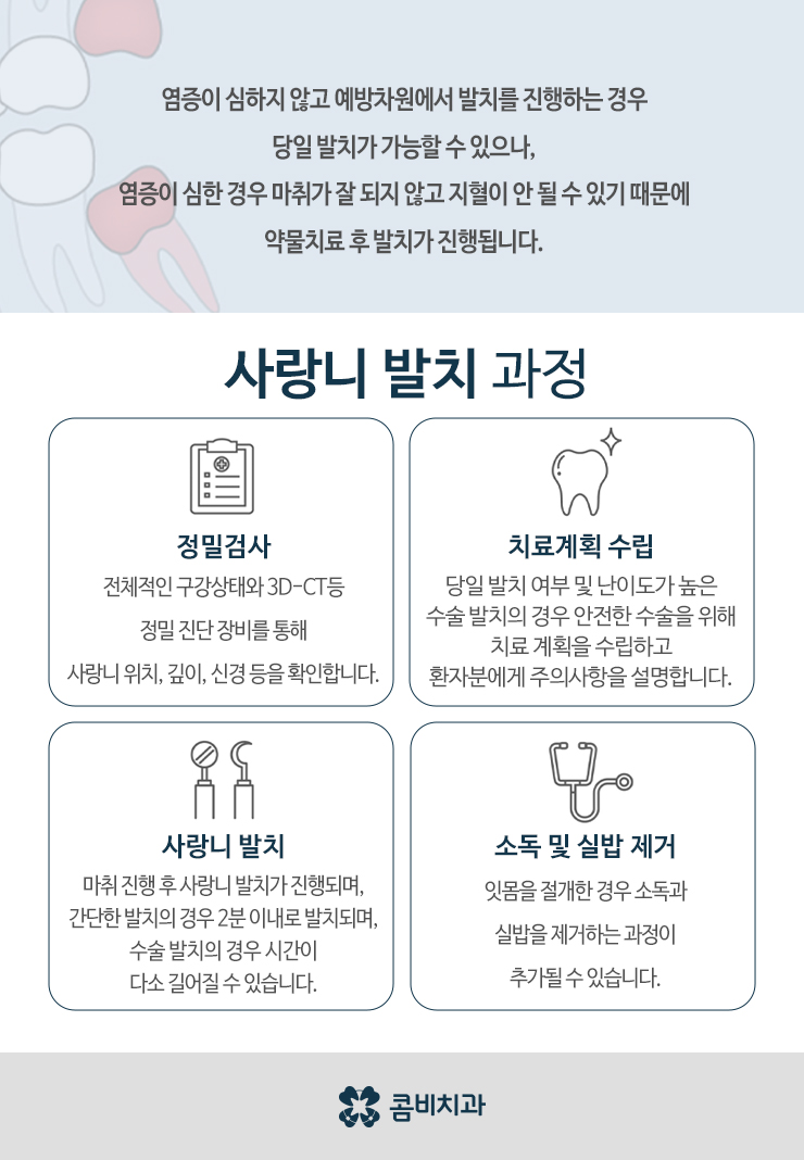 사랑니를 덜 아프게 뽑기 위해서는 이처럼 사랑니 문제가 커지기 전에 발치 계획을 미리 세우는 것이 좋으며 사랑니 발치 후 통증의 경우에는 사랑니의 발치 시점과 담당 의사의 경험과 실력, 시술 후 회복 기간에 컨디션 관리와 주의사항을 얼마나 잘 지키는지가 사랑니를 보다 수월하게 뽑고 회복할 수 있기 때문에 무작정 미루지 마시고 현명한 대처를 하는 것이 사랑니의 수월한 발치과정 뿐 아니라 그로 인한 문제를 미연에 잘 방지할 수 있습니다