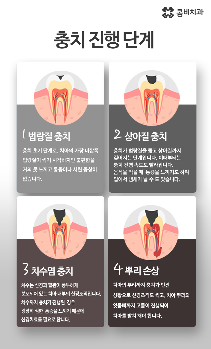 충치가 더 진행되어 신경 가까이까지 도달하면 통증이 분명해지기 시작하며 가만히 있어도 욱신거리거나, 밤에 통증이 심해지는 경우도 있어요. 이 단계에서는 신경치료가 필요할 수 있으며 신경치료는 치아 내부의 염증을 제거하고 통증을 없애는 치료이지만, 치아 구조가 약해지기 때문에 이후 보강 치료가 함께 이루어지는 경우가 많아요.